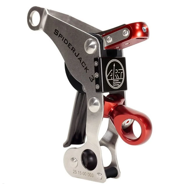 Multifunctional, self-blocking rope control device for the running double rope. The running rope is directly in front of the climber so it is possible to pull and feed the rope very comfortable with one hand or hand over hand into the device. Turning it in the releasing position and pressing the thumb brake needs very little force. So speed regulation is very easy. This smoother handling allows for more convenience and safer feeling when using the speed control. The SpiderJack 3 has a secured locking position function. This gives a maximum of safety when working. The frame is made of high quality stainless steel, so the danger of failure is very low even under high stress.