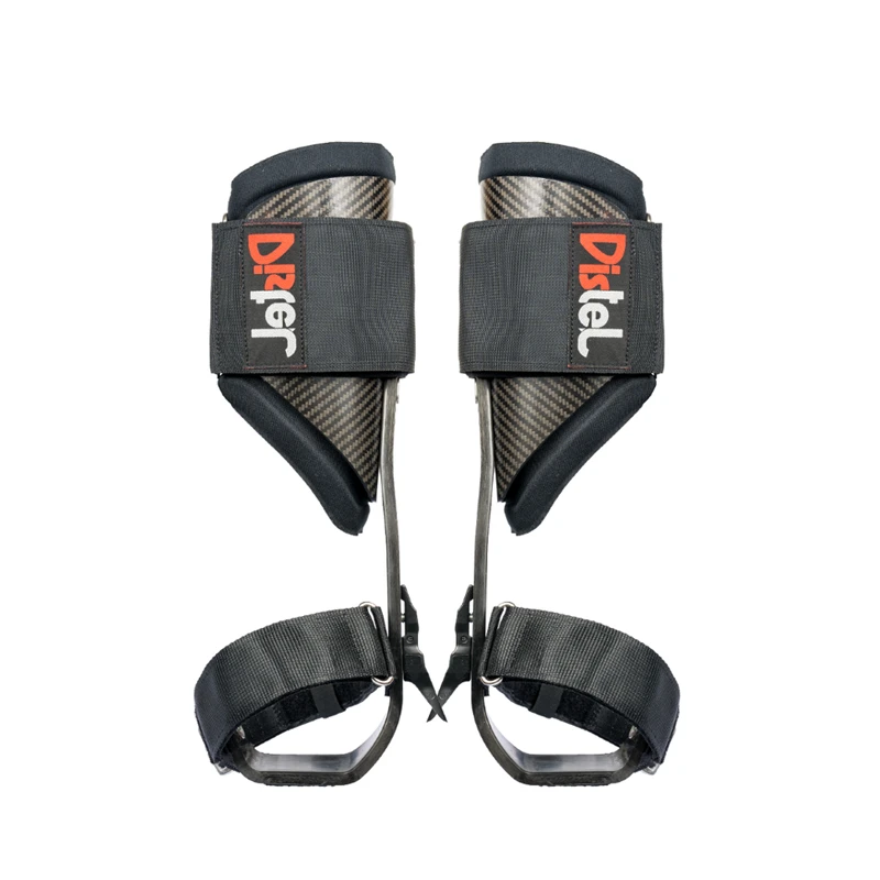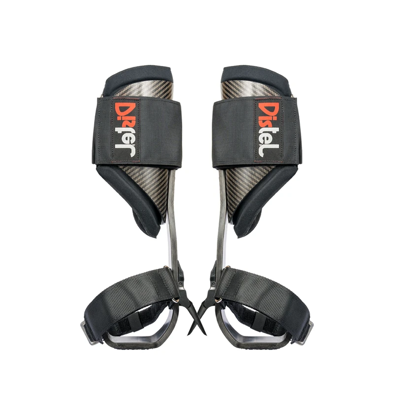 The popular Distel Carbon climbing spurs with velcro straps top and bottom for quick and easy attachment.