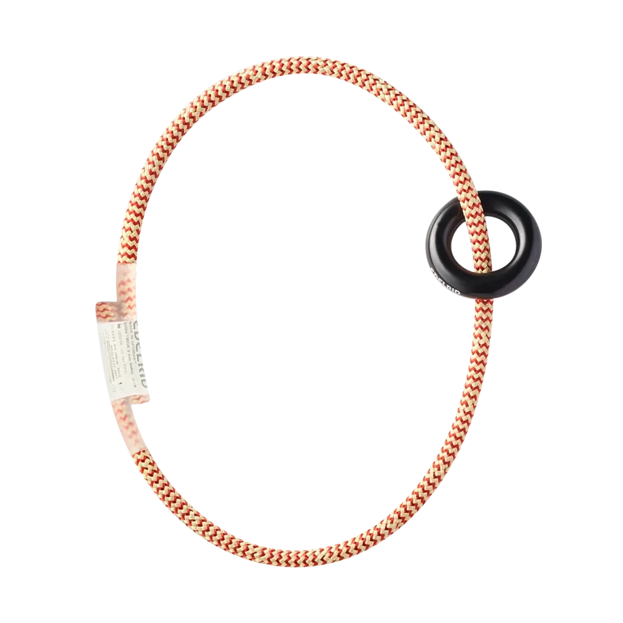 Sewn round sling with integrated aluminium ring for use as a multifunctional sling anchor and as a spare part for the ADJUSTABLE CAMBIUM SAVER. Made of friction knot rope with a kernmantle construction and aramid in the sheath, as well as in the core, for increased cut and abrasion resistance.