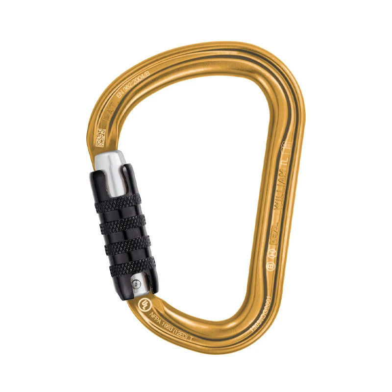 The lightweight WILLIAM large-capacity asymmetrical carabiner is made of aluminum. It has a pear shape that is practical for easily connecting multiple items. Its fluid interior design and Keylock system facilitate handling. The WILLIAM carabiner is available in three locking systems: automatic TRIACT-LOCK or BALL-LOCK system, or the manual SCREW-LOCK system. WILLIAM can be connected to the CAPTIV bar to favor positioning of the carabiner along the major axis, to limit the risk of it flipping and to keep it integrated with the device.