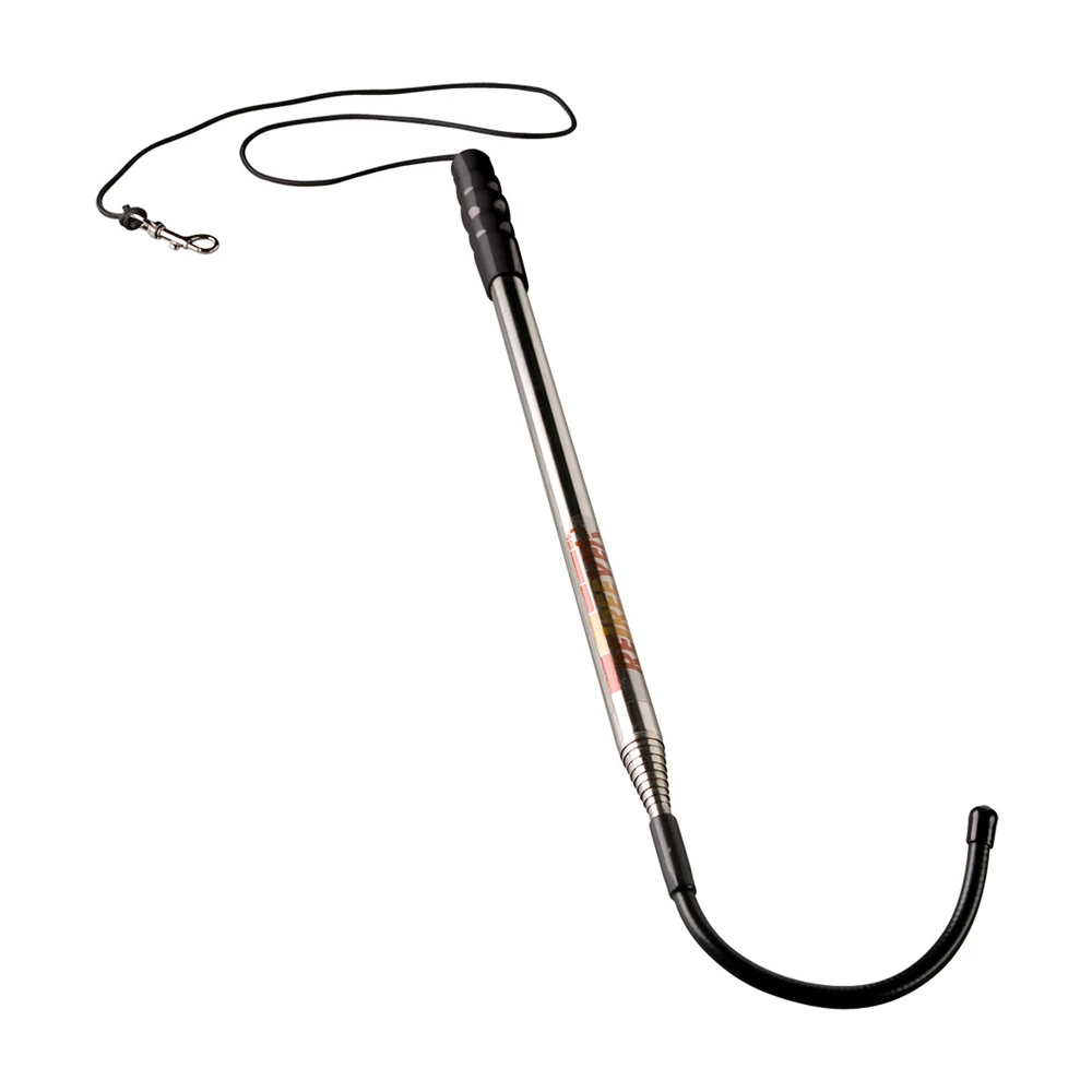 Telescoping stainless steel reach tool with tether and snap. Adjusts from 19-inches to 10-feet.
