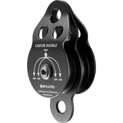 This double pulley is particularly well-suited to the hoisting of heavy loads. With two pulleys and four attachment points, it can be used in complex block and tackle systems.